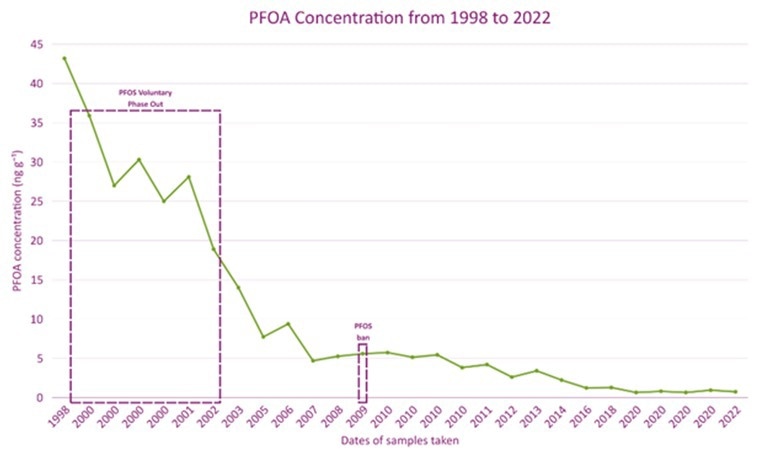 Although overall PFAS levels fell sharply from 1998 to 2022, some of the newer replacement chemicals increased over the same period. One example is PFNA – a type of PFAS used in the production of non-stick coatings and water-repellent treatments for fabrics which has faced fewer restrictions than older compounds like PFOS. Its concentration doubled during the study period, rising from 3 nanograms per gram to 6 nanograms per gram.